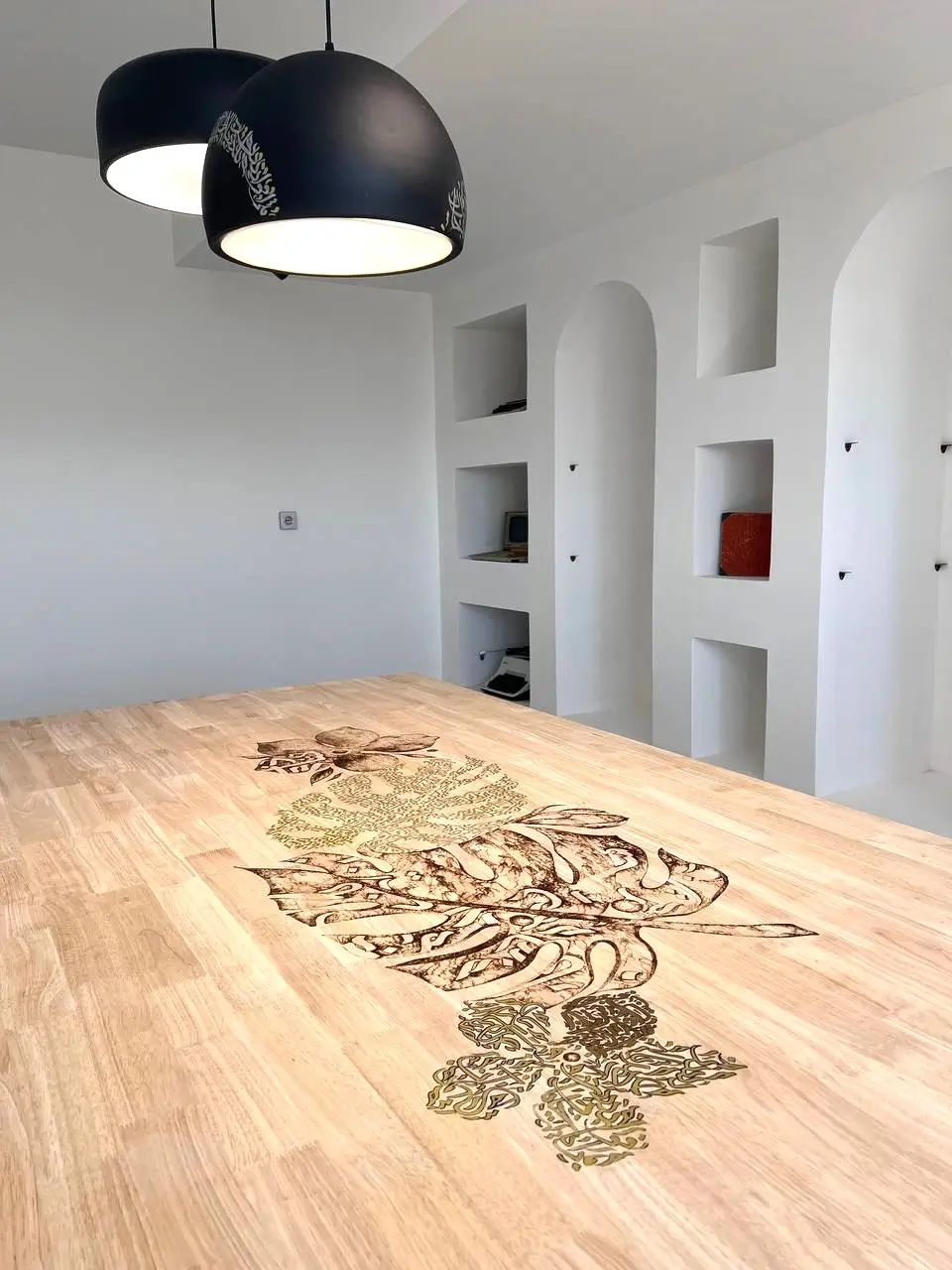 Meeting table for 10 people, burnt wood design, combination of painting and calligraphy. Construction and design